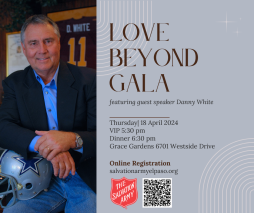 Danny White, former quarterback for the Dallas Cowboys is the guest speaker at The Salvation Army of El Paso's annual charity gala. The event features dinner, cash bar, silent and live auction items, and a VIP meet and greet with Danny White. Individual tickets, VIP tickets, and table sponsorships are on sale now. The Salvation Army has served El Paso for more than 125 years providing food, shelter, financial assistance, and spiritual care to the community. We hope you will join us for this special event.